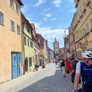 On a eu droit à de bonnes montées pour arriver dans la très charmante Rothenbourg (le village médiéval de la route romantique le plus connu et le plus visité), mais ça valait le coup ( et en passant, on a tout monté sans descendre du vélo! 💪). On est arrivés dans la ville fortifiée à bout d'haleine et ruisselants de transpiration (🫢), mais quel spectacle en arrivant au sommet et en roulant à travers les portes de la ville. Magique! On se croirait vraiment dans une carte postale.
