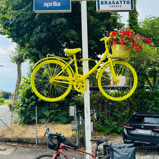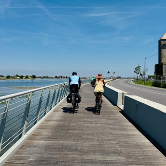On a longé des canaux, des Lagunes, on a vu Venise au large, on a vu la campagne, des vignes et on a vu la mer. On a roulé pas mal sur des pistes cyclables, mais la route aussi. On a roulé sur la belle asphalte, mais aussi sur la gravelle (on s’est fait couvrir de poussière quand un gros camion nous a croisé sur une petite route de terre😳). Beaux paysages. Le Lido de Venezia (où on a pris un de nos traversier) était très joli ! Vers la fin de la journée, j’ai eu l’impression de frapper un mur.😳. J’ai mal aux fesses😳. Contente d’être arrivée à destination - et aussi prête à repartir demain!