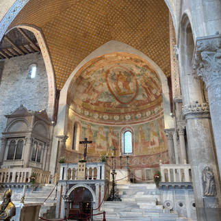 On a roulé sur les plus belles pistes cyclables. Ca fait drôle s’exciter pou l’asphalte, mais un bon bout de piste s’est fait sur une piste fraîchement pavée qui était ombragée et c’était génial😉. En roulant, on a vu une affiche pour un site faisant partie des héritages mondiaux de l’UNESCO. Quelle belle surprise. Aquileia est une ancienne ville romaine datant de 200 ans av. JC. A l’entrée de la ville, on a pu voir les colonne de l’ancien forum (des archéologues étaient en train de travailler). Mais le bijou de cet endroit est la basilique de Santa Maria Assunta d’Aquileia. (https://www.fondazioneaquileia.it/en/must-see/basilica ) Ils nous ont laissé rentrer malgré nos tenues pas super respectueuses ( et sales) …. On a été époustouflés par ce qu’on a vu; tout (mais tout) le plancher couvert de mosaiques et murs recouverts de fresques colorées ( la crypte aussi!).