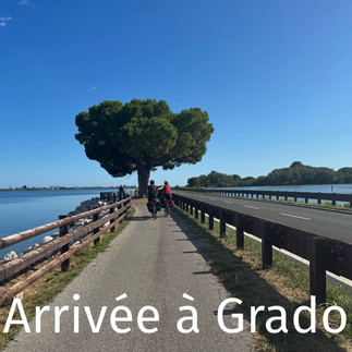Grado, surnommée l’île du soleil (isola del sole) est une charmante petite villes côtière d’environ 8,000 habitants.situee dur la péninsule entre Venise et Trieste. Construite parmi les lagunes, on y est arrives en pédalant sur une piste cyclable sur une mince chaussée (il n ‘y avait de la place que pour 2 voix et une piste cyclable) traversant les lagunes. Cette chaussée était longue de quelques kilomètres et donnait un air presque dramatique à notre entrée dans la ville. Vraiment spectaculaire,