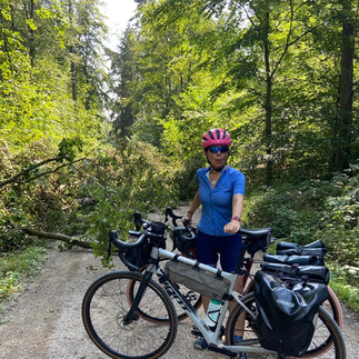 A part les montées - et une en particulier où j'ai poussé mon vélo (avec les bagages, c'est quand même assez lourd...) - on a trouvé notre route bloquée par un gros arbre qui était tombé. Il a fallu porter nos bagages et vélos 'à la main'..... un peu plus loin, on s'est trouvé sur une rue dans une ville qui était bloquée par une grue. On est passés quand même, mais même si on ne comprend pas l'Allemand, on est pas mal sûrs qu'on ne s'est pas fait d'amis avec les travailleurs 🫢.